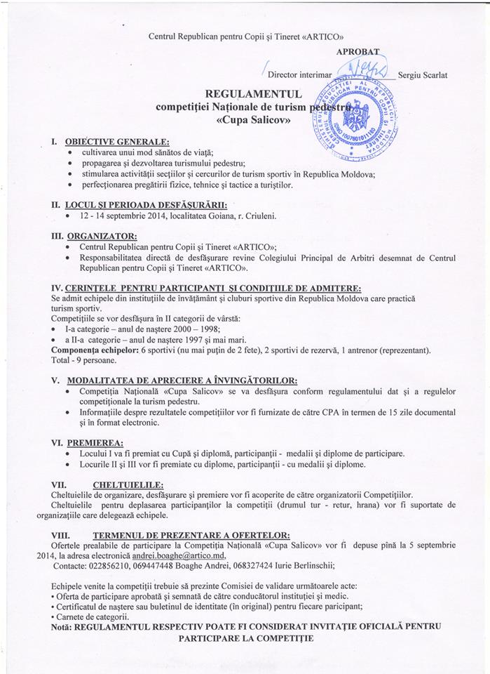 Competiţiile naţionale de turism pedestru «Cupa Salicov» vor avea loc pe 12-14 septembrie 2014 în localitatea Goiana, raionul Criuleni.